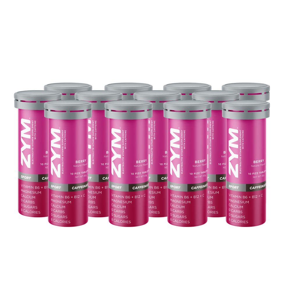 ZYM BERRY (with caffeine), with natural flavors of strawberry, raspberry and red currant, has a light fresh tart taste of red berries, and is designed to combat fatigue, muscle cramps and lactic acid build-up. This is an Electrolyte Vitamin Supplement, containing better ingredients, dissolves faster, contains no sugar, has added vitamins, and tastes far better than any electrolyte tablet on the market. Truly, the taste of ZYM SPORT blows away the competition.